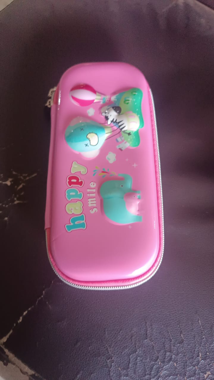 The compact rectangular shape opens with a smooth zipper, offering a spacious interior to hold pencils, pens, erasers, sharpeners, rulers, and even small notes. Its lightweight yet protective design ensures that stationery items remain intact and undamaged inside school bags. The bright pink color and cheerful “Happy Smile” message make it an instant favorite among young students.