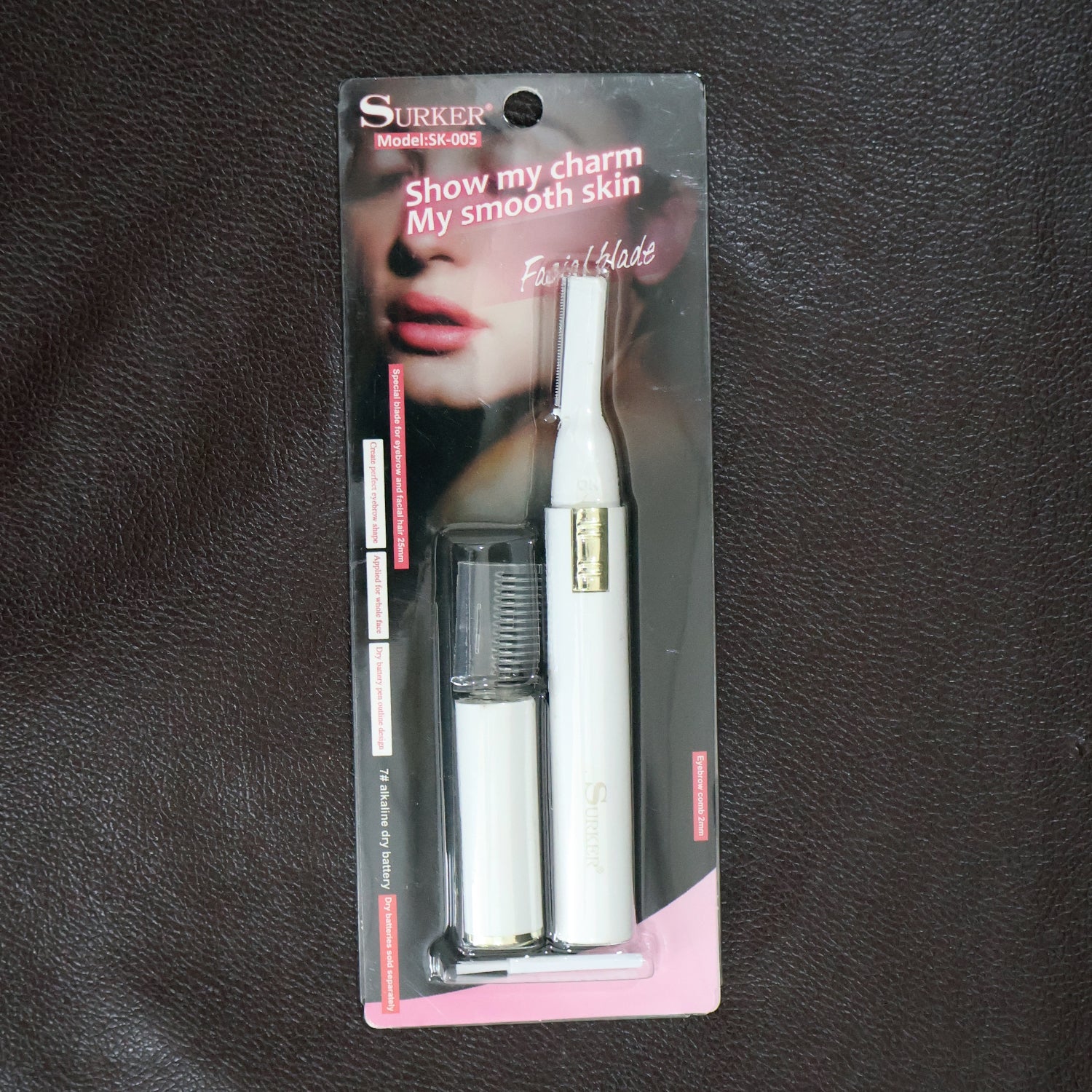 Tidy up brows and remove facial fuzz quickly with this slim, battery-powered trimmer. The precision stainless-steel blade glides gently over delicate areas like eyebrows, upper lip, chin and sideburns without pulling. A snap-on comb guard helps shape and maintain brow length, while the included cleaning brush keeps the head hygienic after each use. Compact, pen-style body with protective cap fits easily in handbags and travel kits—perfect for on-the-go touch-ups.