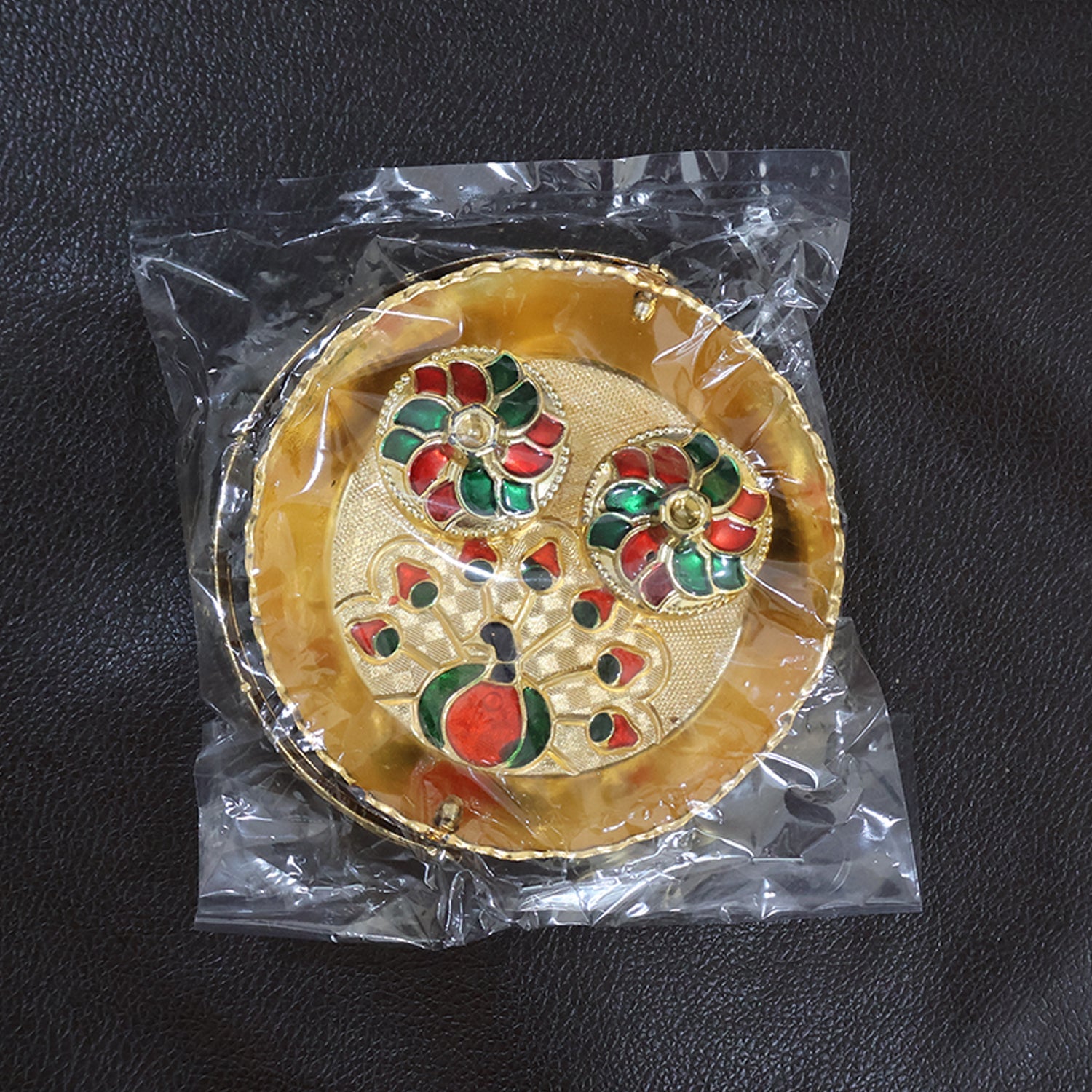 Elevate your aarti setup with this exquisitely crafted pooja basket thali. Designed in a traditional round tray with a folding handle, it features a colourful peacock meenakari motif and comes with two matching lidded bowls for roli–chawal, haldi, chandan or sindoor. The bright gold-tone finish and fine embossing add a festive sheen, while the compact size fits perfectly on the mandir shelf or aarti plate. Ideal for daily puja and as a graceful gift for weddings, griha pravesh and Diwali.