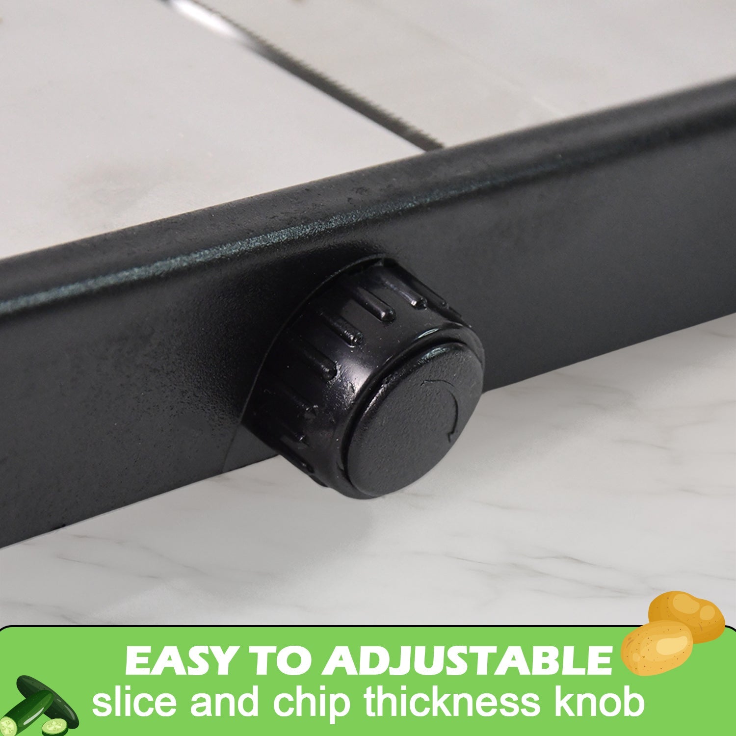 • Auto knob cuts 1mm to 5 mm cuts potatoes onion, carrots, radish, cabbages, cucumber